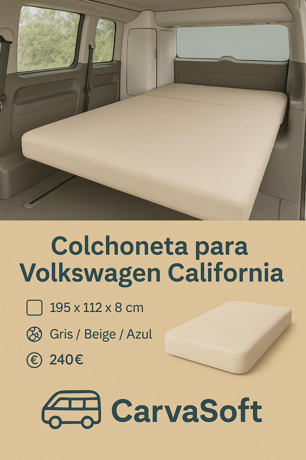 Optimiza tu experiencia en carretera con nuestra colchoneta a medida, diseñada específicamente para la cama trasera de tu VW California. Con dimensiones precisas de 198 x 133 x 8 cm, esta colchoneta garantiza un ajuste perfecto, proporcionando el máximo confort y aprovechamiento del espacio disponible.
